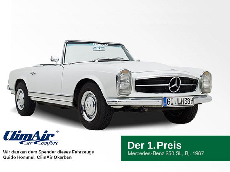 Bei diesem Mercedes-Benz 250 SL handelt es sich um den 1. Preis der 19. Oldtimerspendenaktion 2013 der Lebenshilfe Gießen e.V. Das mit 2,5 l Hubraum ausgestattete elegante Cabriolet lief nur ca. 5000 Mal vom Band. 150 PS erlauben eine Höchstgeschwindigkeit von 200 km/h. Sportlich wurde die Baureihe auch – höchst erfolgreich – eingesetzt: Mit der modifizierten Rallye-Version gewann Rennfahrer-Legende Eugen Böhringer 1963 eine der härtesten Wettbewerbe dieser Zeit: die Rallye Spa-Sofia-Lüttich.